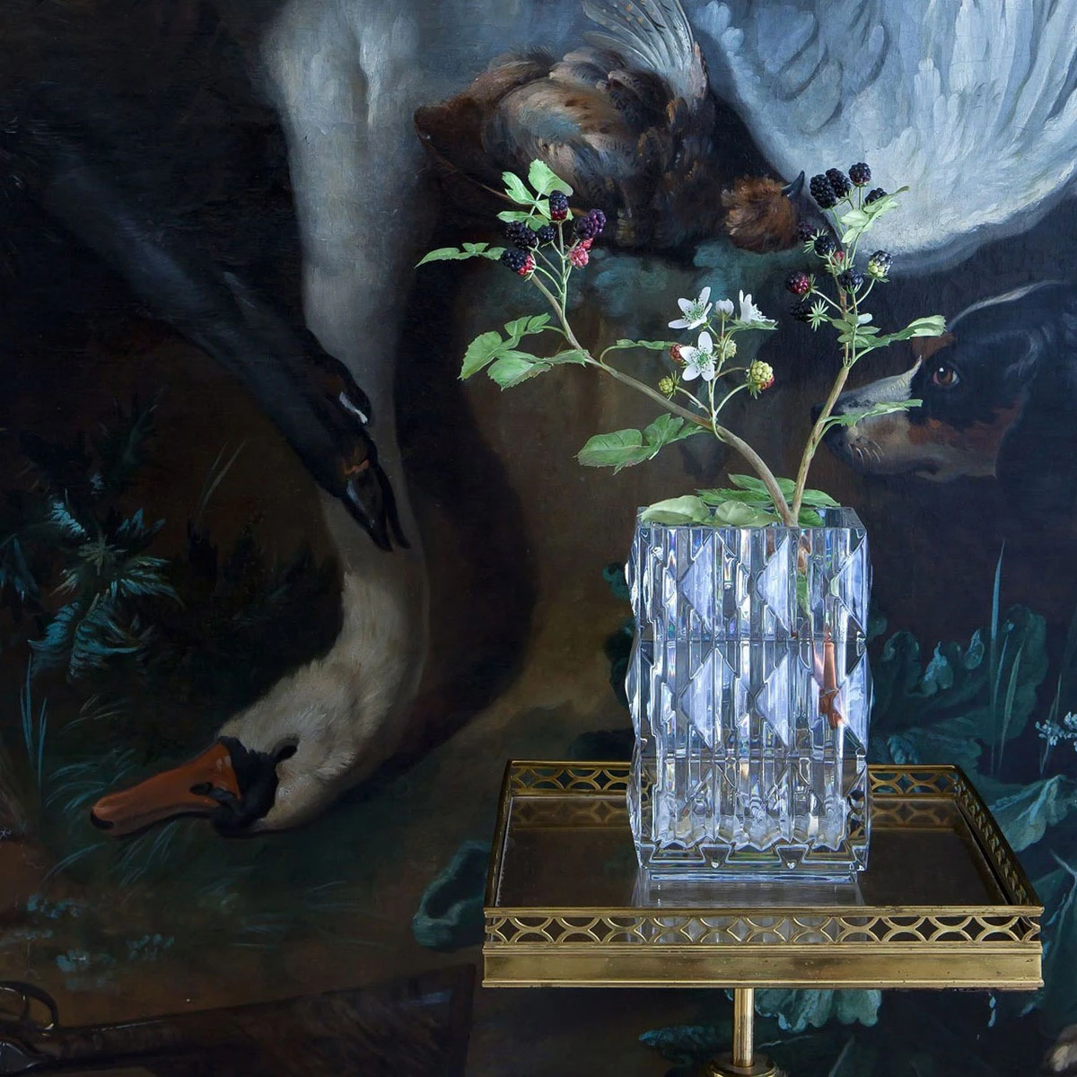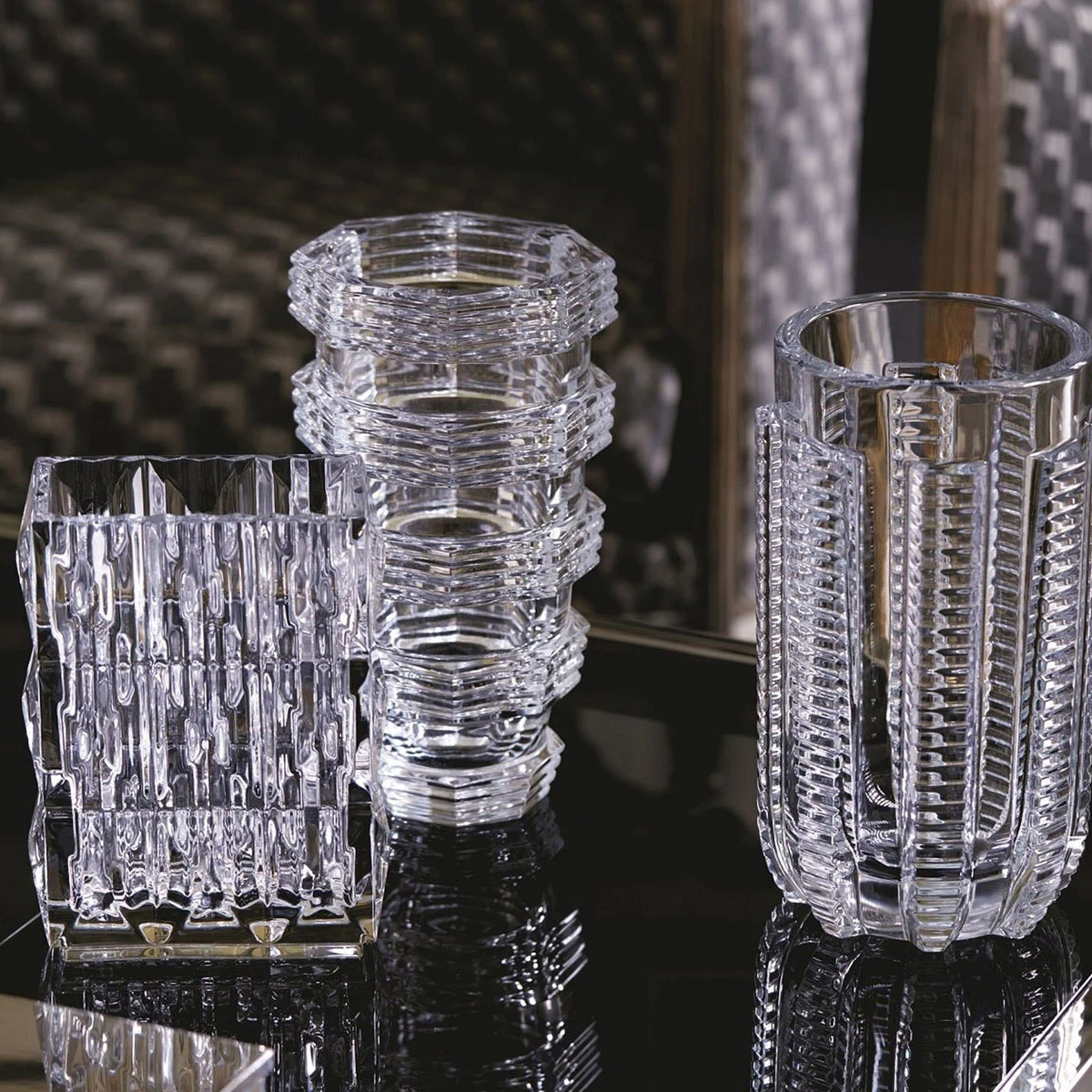 As the light interacts with the crystal, it creates an incredible, almost psychedelic, optical effect that scintillates brilliantly and shimmers radiantly. Referencing Art Deco-era design, this lavish cut crystal surface scatters the crystal reflections.
