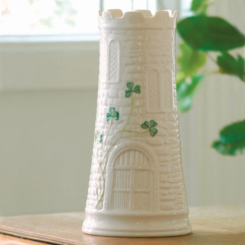 This unique, turret-shaped vase is perfect for holding your favorite blooms. Intricate castle design, complete with drawbridge doors. Hand-painted. Made in Ireland. 7 3/4″ IE 211 China BELLEEK Belleek Pottery LTD 766943022232 B2223 Vase Castle 3/4″ 7 China Belleek
