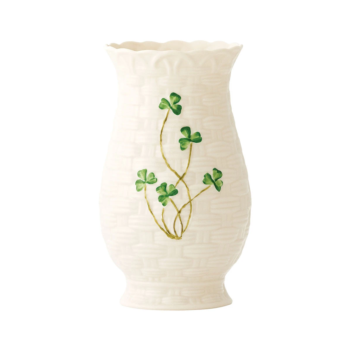 Belleek’s Kylemore 6 inch vase provides ample room for fresh daffodils, tulips or lilies. Its basket-weave-textured, white embossment complements flowers of any hue. Five hand-painted shamrocks adorn the body making this piece a great way a bit of the Irish countryside to the mantle, dining table or entryway. The shamrocks climb to toward an elegantly scalloped and thick-lipped rim. Glazed inside and out, this vase is handmade and hand-painted. Made in Ireland. H: 6″ IE 211 China BELLEEK Belleek Pottery LTD 766943026759 B2675 Vase 6″ Kylemore China Belleek