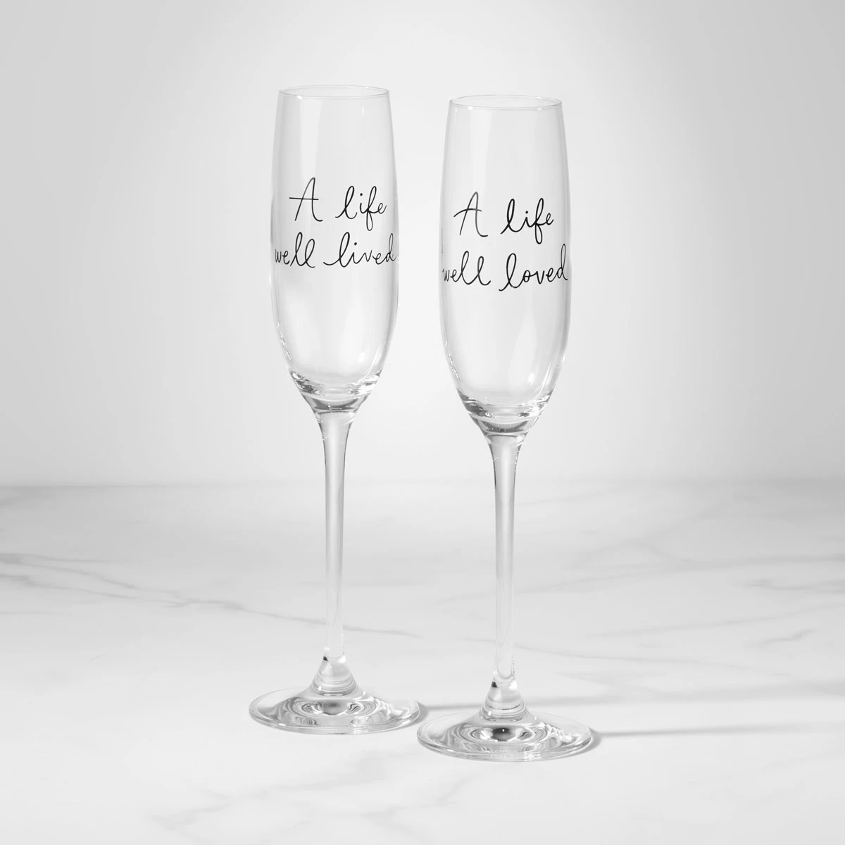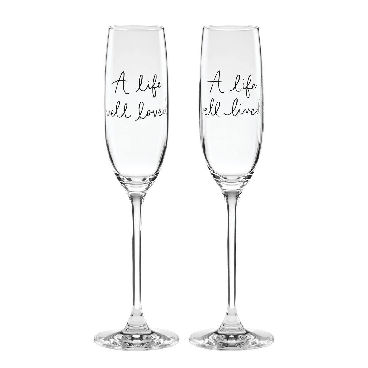 How sweet! Make a toast to the one you cherish the most. Featuring, “A life well loved,” on one glass and, “A life well lived” on another. Use this inseparable pair to celebrate all things that should be appreciated in life! Cap: 6oz. SL 15 Crystal Lenox Lenox 882864868251 894021L Pair Flutes Toasting Life Charmed Lenox York New Spade Kate