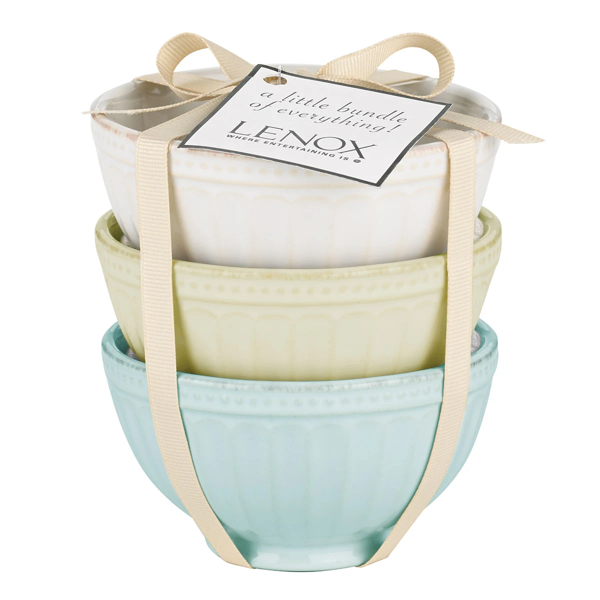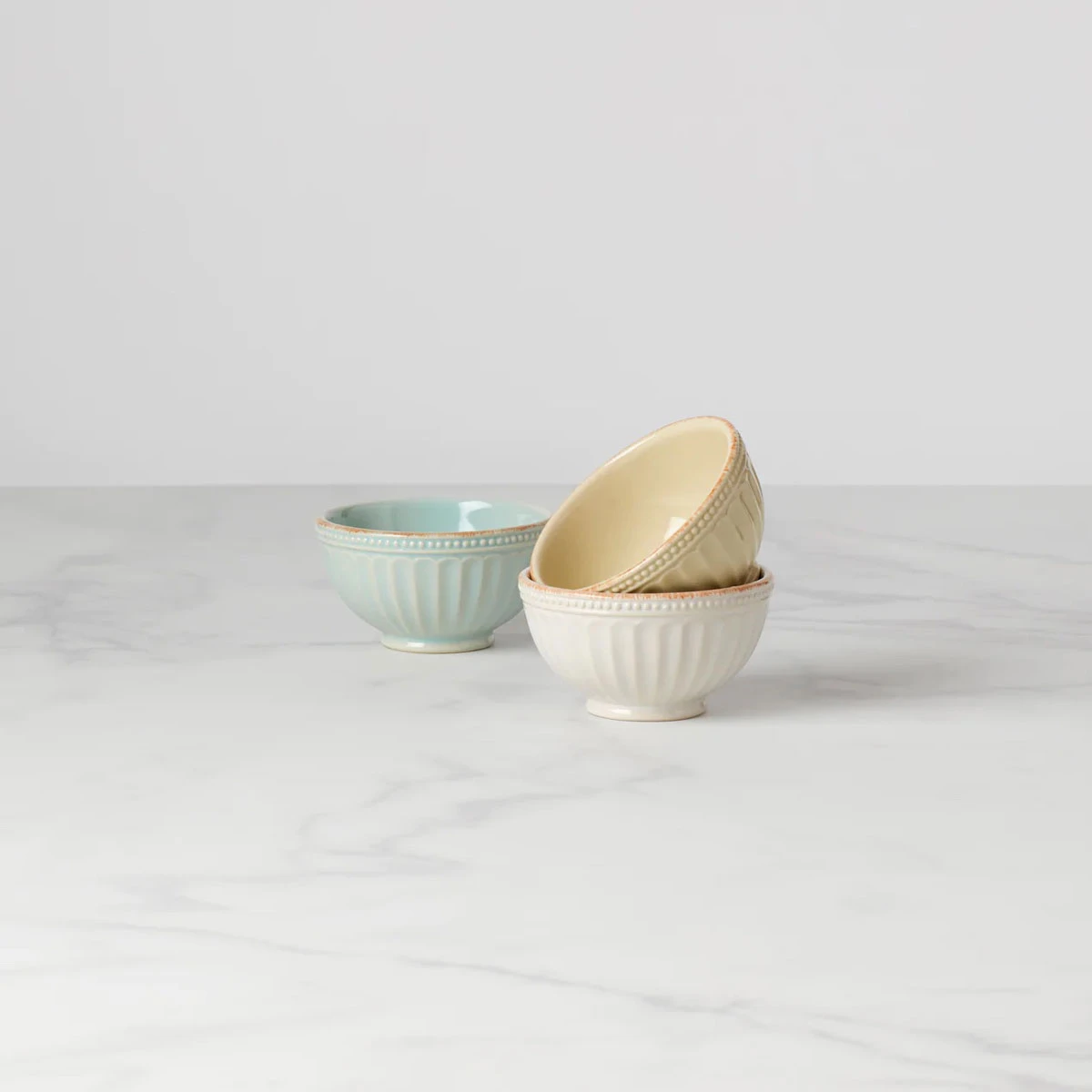 This set of three mini ceramic stoneware bowls features rustic grooves along the sides, and a pattern of tea-stained beads on the outside border, for a quaint touch. The set includes white, pistachio, and ice blue. This item is microwave and dishwasher-safe, for added convenience. W: 4″ CN 219 China Lenox Corp Lenox 882864593092 858038L 3 of Set Bowls 4″ Groove Perle French Lenox