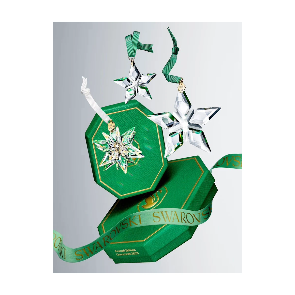 It is time to wish upon a star! Continuing the iconic tradition of the Swarovski Annual Edition Ornaments, this shining 2023 design is inspired by Swarovski’s magical heritage of divine geometry and complex simplicity. The clear star is expertly crafted with 97 facets and is attached to a luscious green ribbon with a gold-tone plated tag, displaying the year and a single chaton. Designed especially for 2023, this collectible ornament will make a truly elegant gift. H: 3″ W: 2.75″ RS 236 Christmas Swarovski Crystal Swarovski Crystal 191453204364 5636253 Star Ornament Dated Edition Annual 2023 Swarovski