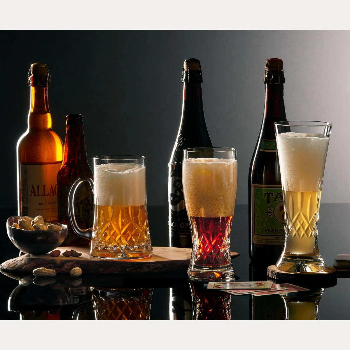 Crafted in crystal with the signature Lismore cutting pattern, these impressively substantial beer glasses are designed to enhance the flavor and appearance of any brew, from delicate Belgian Pilsners to robust English Stouts.
