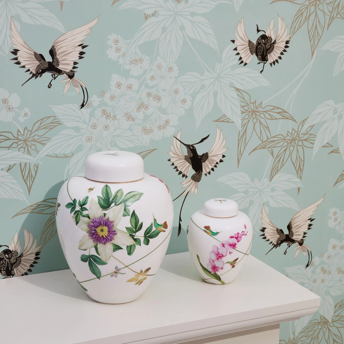Hummingbirds are a marvel of nature, constantly moving in a flash of exotic colour and perpetual motion more ethereal than earthly. This collection of Hummingbird vases and jars takes inspiration from these living miniature feathered jewels, offering a palette of striking colours on beautifully silky white fine bone china. Harking back to the mythical world of Makeig-JonesFairyland Lustre collection, there an otherworldly quality to these pieces. Each intricately detailed item champions oversized blooms and playful hummingbirds and is expertly hand-finished with 22 carat gold. Dreamt up and made in England. H: 9.8″ W: 7.9″ D: 7.9″ Cap: 4.5 GB 211 China WWRD Wedgwood China 701587436878 1055514 9.8″ Vase Lidded Hummingbird Wedgwood